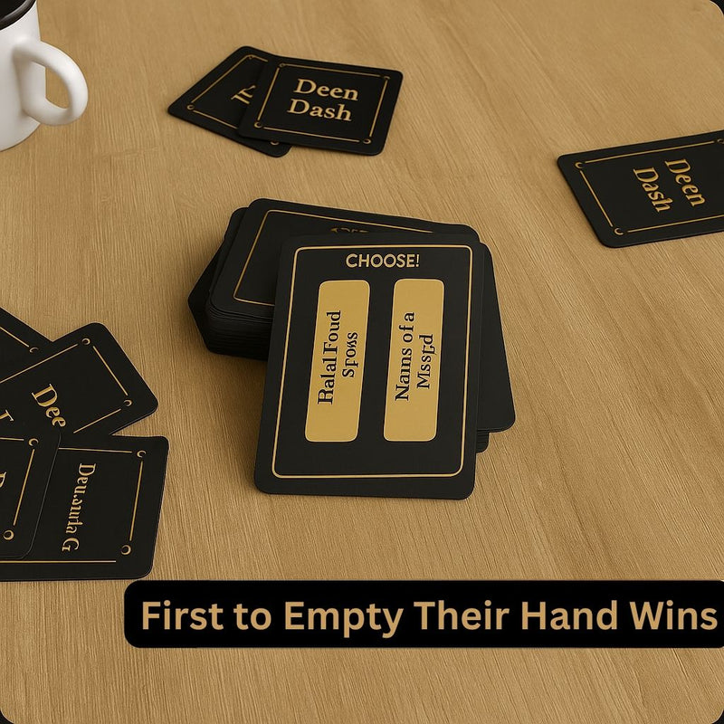 DeenDash is a fast, funny, and faith-friendly Islamic card game made for Muslims of all backgrounds. With 135 beautiful cards, you’ll test your Islamic knowledge, laugh out loud, and learn something new every round.